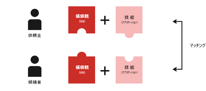 どれだけ優れた技能をもった人材でも、会社の社風や価値観と合致しなければ、長く就業することはできません。喩えるならば、パソコンのアプリケーション(技能)とOS(社風・価値観)の関係です。当社では、両者の性質を徹底的に分析し、データ化しづらい「相性」まで考慮したうえでマッチングを行います。こうした姿勢を通して初めて、高い定着率と活動を実現できるのです。